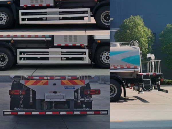 其它 | 1.該車裝備有罐體,噴水架等專用作業(yè)裝置,用于實現(xiàn)道路的清潔、灑水作業(yè);2.罐體總?cè)萘?.56立方米,有效容積:8.16立方米,罐體外形尺寸(長×寬×高)mm:3600×2400×1440,運輸介質(zhì):水,密度1000千克/立方米;3.儲能裝置種類/單體生產(chǎn)企業(yè)/總成生產(chǎn)企業(yè):磷酸鐵鋰蓄電池/寧德時代新能源科技股份有限公司/寧德時代新能源科技股份有限公司;4.驅(qū)動電機類型為永磁同步電機,額定功率為105kW,峰值功率為165kW;5.ABS型號/生產(chǎn)企業(yè):CM4XL-4S/4M/廣州瑞立科密汽車電子股份有限公司;6.側(cè)防護(hù)材料:鋁合金,連接方式為螺栓連接;后防護(hù)材料:Q235,連接方式:螺栓連接,后防護(hù)斷面尺寸:60×120(mm),離地高度為430mm;7.該車選用4500mm軸距,整車長度(mm)/前伸(mm)/接近角(°)對應(yīng)關(guān)系:9500/1000/6,9400/900/6,9100/600/11,8500/0/11,選裝前噴水架,前置電子水炮. | ||