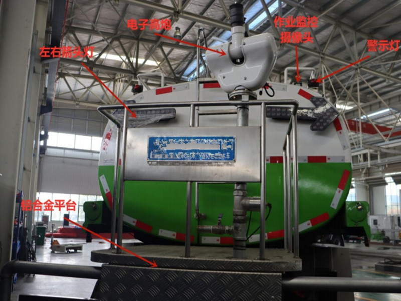 前沖圓錐噴嘴沖洗路面寬度可覆蓋 6 條車道;后灑圓柱噴嘴,噴出均勻的扇形水霧,寬度可到 14m,