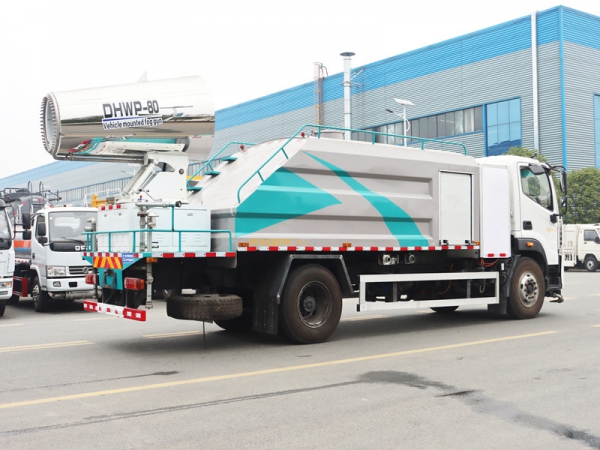 工作原理:采用自吸式雙級離心泵,效率高、灑水寬度大、水槍射程遠,低壓水泵由底盤變速器取力器通過傳動軸直接傳動。霧炮機組由底盤電池帶動霧炮風扇電機、不銹鋼多級離心泵,進行噴霧降塵工作。