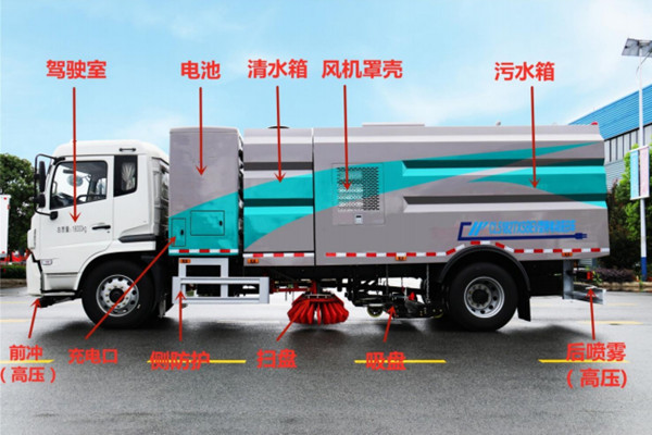 該洗掃車采用純電動二類底盤改裝、風機、清水箱、垃圾箱、左右立掃、掃盤降塵系統、左右高壓側噴高、吸盤內置高壓主噴桿、氣動系統、液壓系統、專用裝置電控系統和副車架等改裝而成。