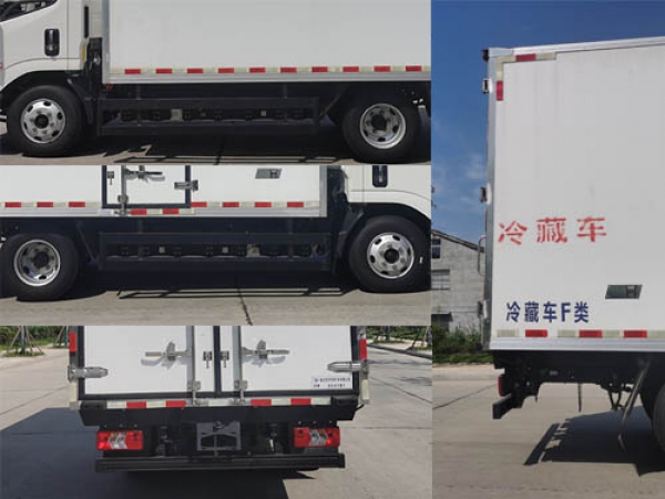 其它 | 選裝制冷量相同的制冷機組,選裝廂體無側門結構,選裝車輪外觀,選裝前部車型標識外觀。車廂頂部封閉,不可開啟。氣剎ABS系統型號/生產企業:VIE ABS-II/浙江萬安科技股份有限公司,選裝液剎ABS系統型號/生產企業:3550A500/浙江亞太機電股份有限公司。電池種類/單體生產企業/總成生產企業: 磷酸鐵鋰蓄電池/寧德時代新能源科技股份有限公司/寧德時代新能源科技股份有限公司。側防護采用冷彎型鋼/Q235-B,螺栓連接;后防護采用冷彎型鋼/Q235-B,焊接連接,截面尺寸(寬×高)(mm):50×100,離地高度為:450mm。選裝采用直接供電方式的ETC車載裝置。整備質量不包含隨車工具,備胎,最小尺寸貨廂重量900kg,最大尺寸貨廂重量995kg,貨箱材質為玻璃鋼+聚氨酯泡沫,厚度80mm。 | ||